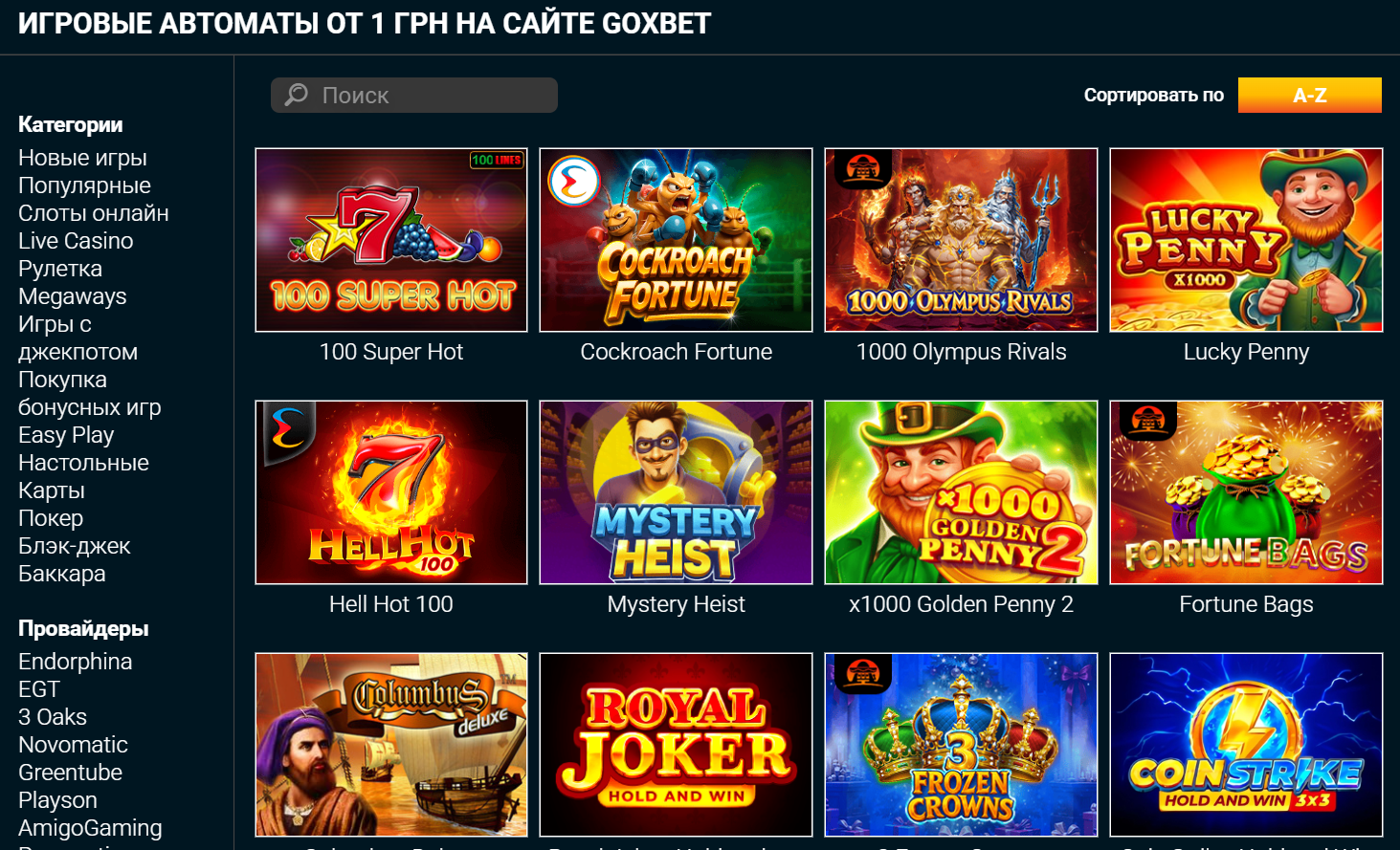 Розділ казино Goxbet містить більше 1500 ігрових автоматів та понад 30 провайдерів. Структура платформи розроблена так, щоб новачок знайшов потрібну гру за кілька кліків, не розгубившись у каталозі. Вступ до платформи показує основні категорії: слоти, джекпоти, живі столи, рулетки, карткові ігри та спеціальні режими швидких ігор.